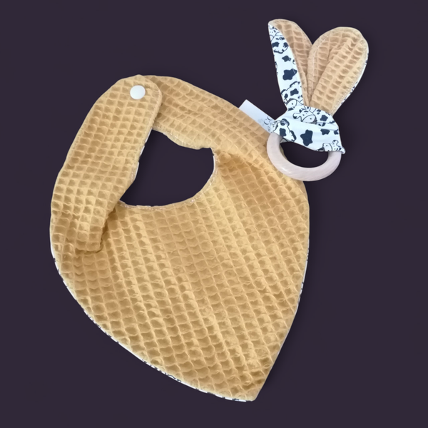 Offrez à bébé confort et douceur avec ce lot artisanal composé d’un bavoir bandana et d’un anneau de dentition “oreilles de lapin”.